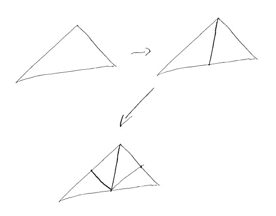 One idea to refine the mesh and hope that this does not happen is to just naively take the worst offender, and cut that boy in two. In other words, one takes the longest edge, and cuts it into two parts, and extends that cut to the rest of the simplex. And then, repeat until it is fine enough. This is the Rivara bisection.